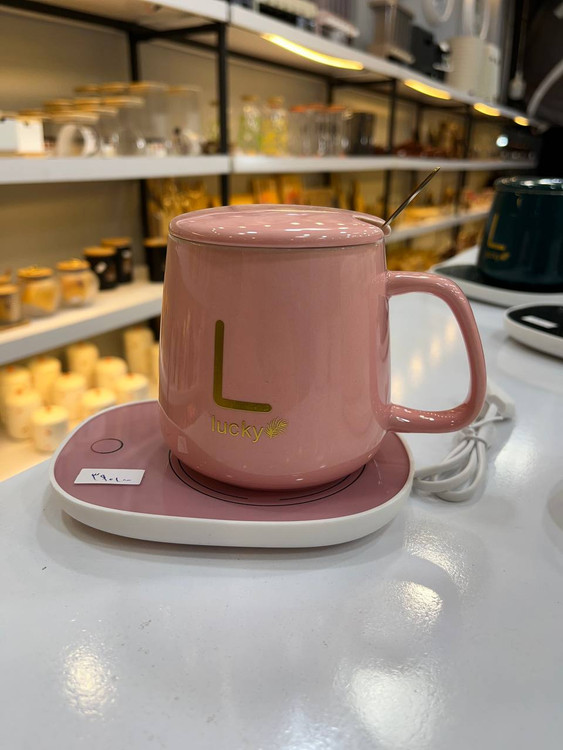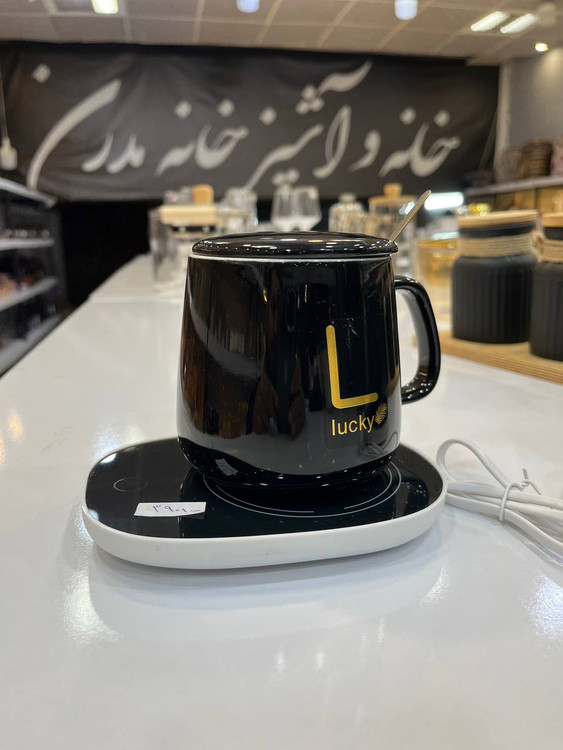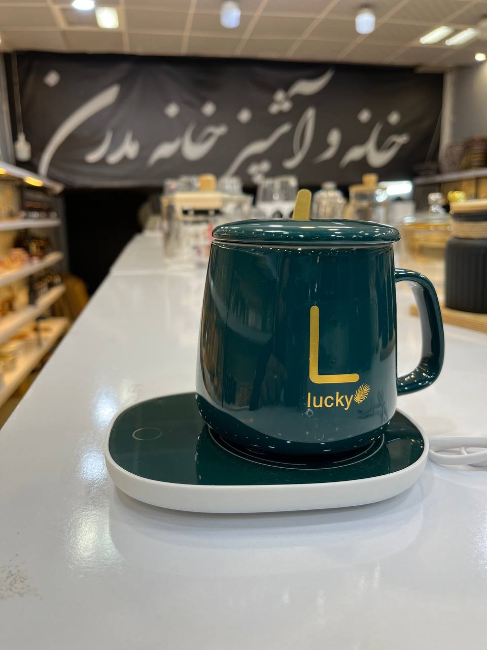 ماگ برند لاکی به همراه صفحه گرمکن که بعد از اتصال به برق و قرار گرفتن ماگ روی آن شروع به ایجاد گرما از پایین ماگ میکند.