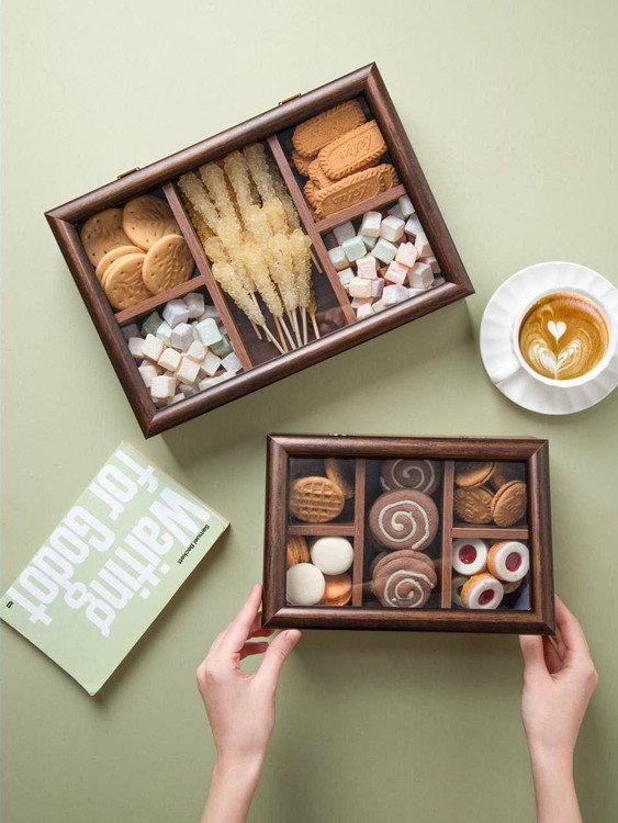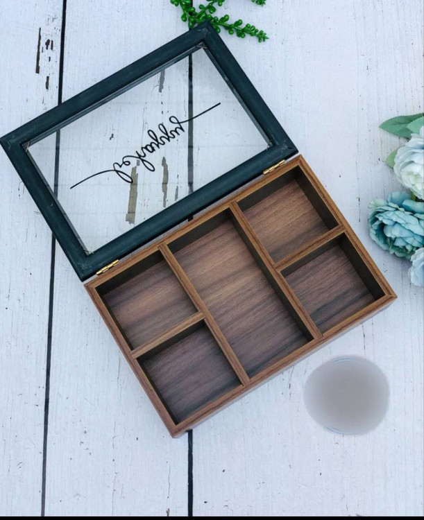 جعبه تیبگ دوخانه از جنس MDF با درب شیشهای شفاف، انتخابی شیک و کاربردی برای نظمدهی به چای کیسهای،نبات و تنقلات.